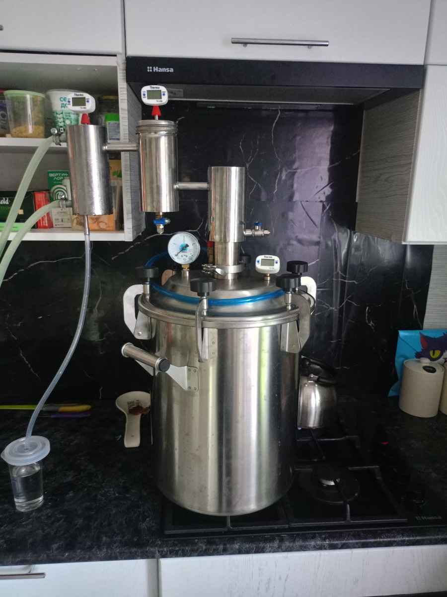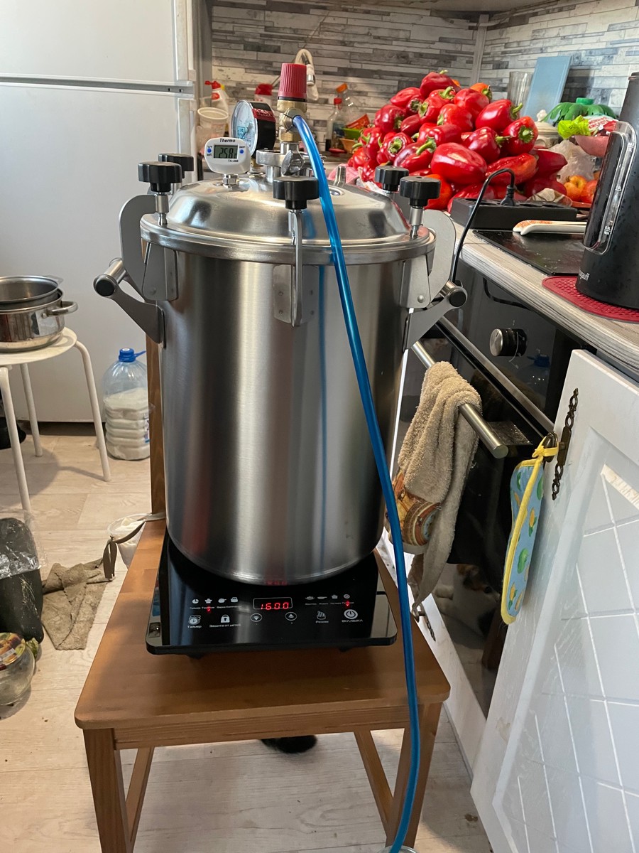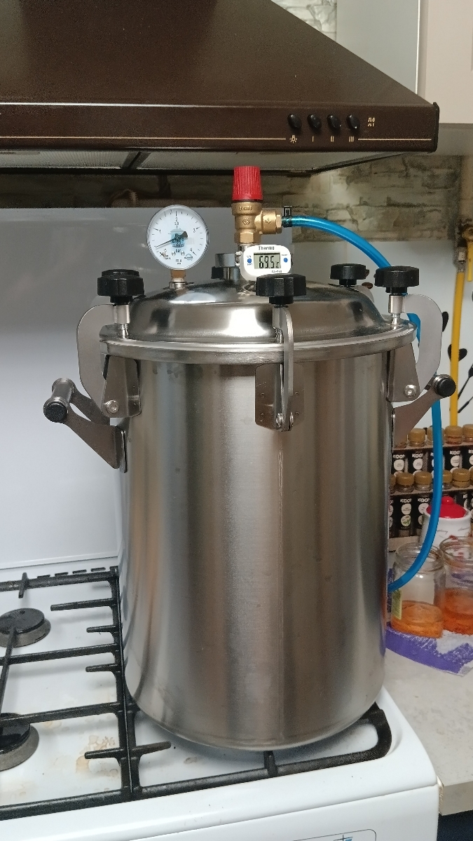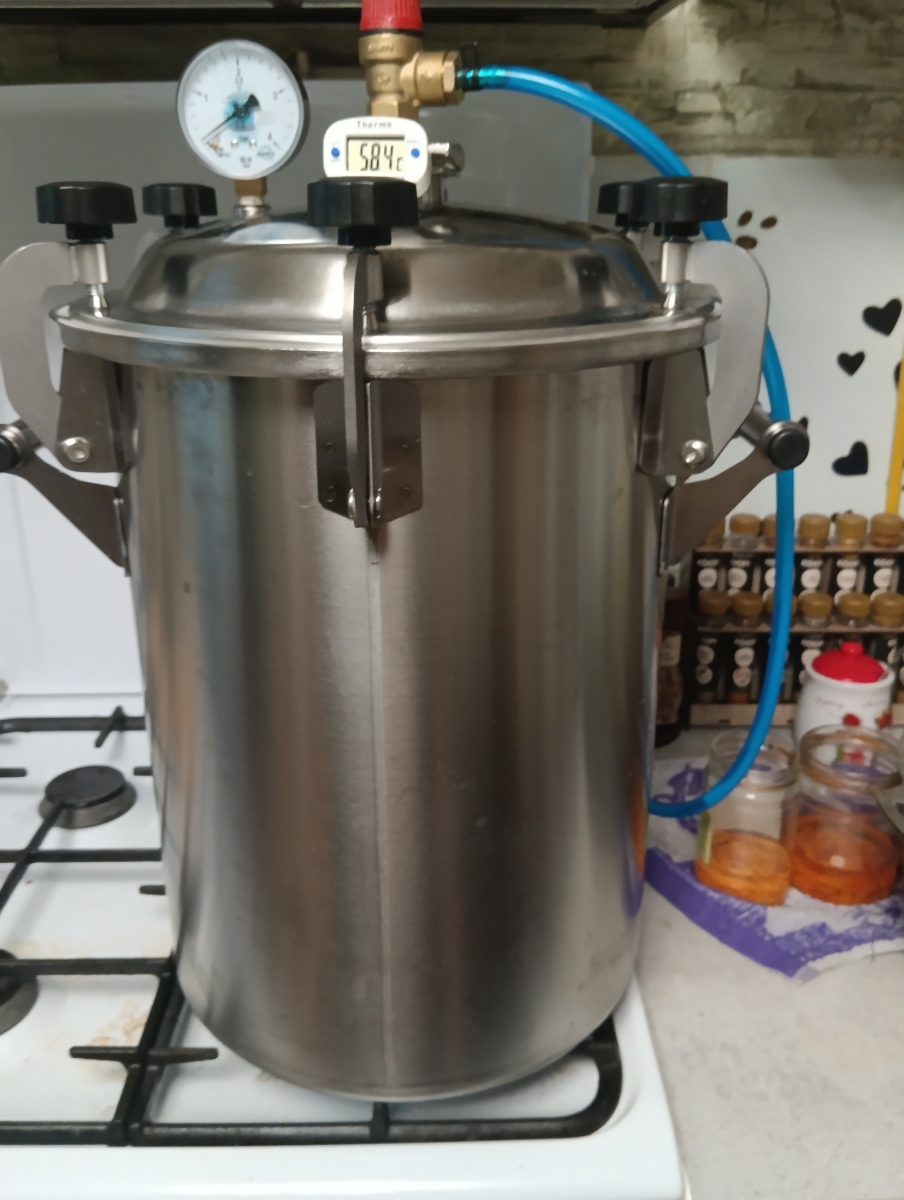 автоклав работает. при первом запуске только с водой на рабочую мощность вышел за 10 минут при 1,5 квт, клапан закрылся на температуре 77.6градусах. при полной загрузке за 1.5 часа на 99.6 градусах при 1 квт. с банками рабочее давление ниже, чем на пустом, при одинаковой температуре - 117 градусов, давление 1 бар. готовой продукции еще нет. автоклав еще в процессе работы.