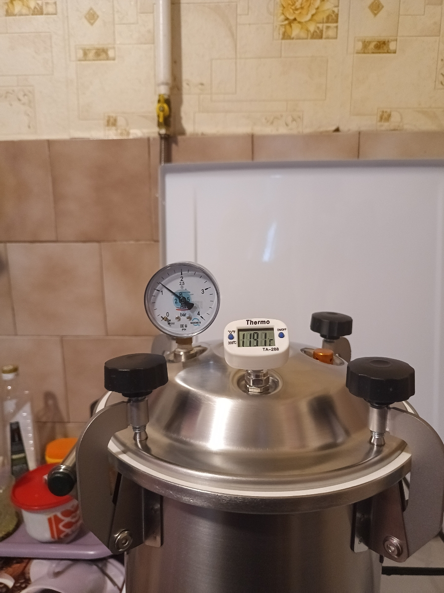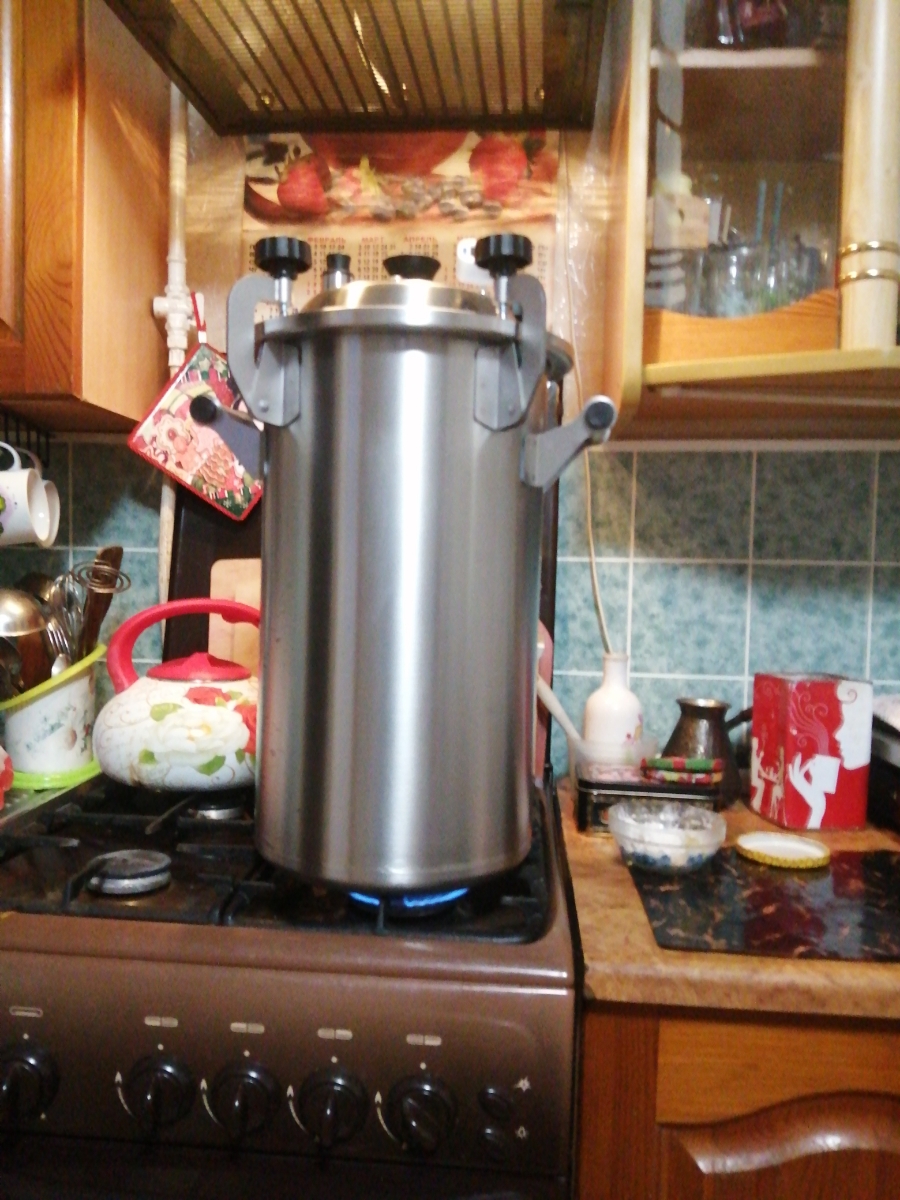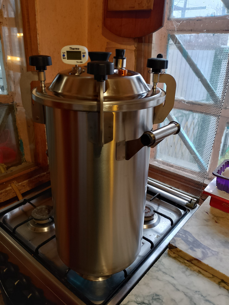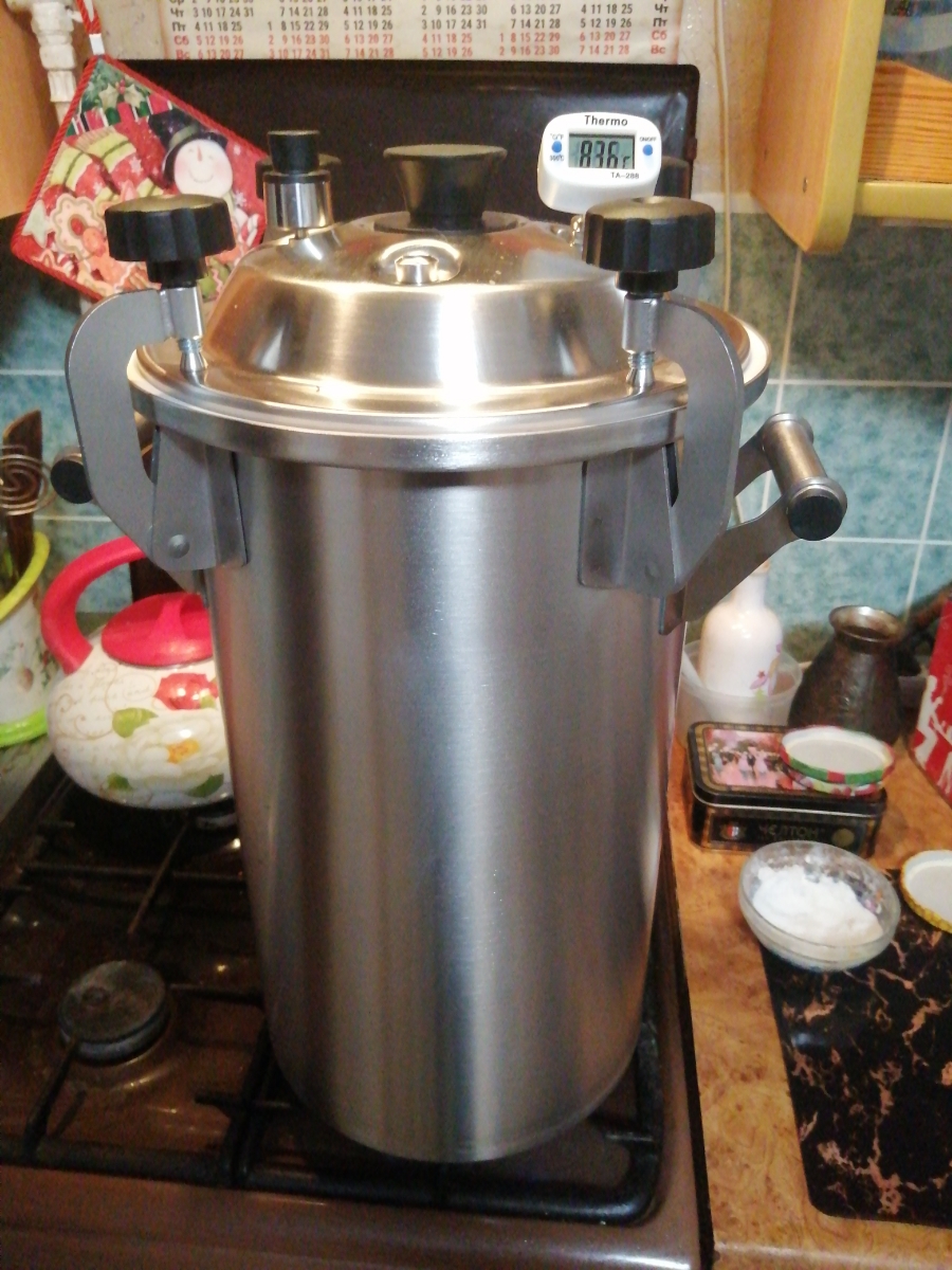 Доставка быстрая, упаковка шикарная. Проверили на приготовлении тушёнки из гуся. Дополнительно покупали зажимы на крышки, с ними все равно влезло 24 баночки по 500 гр( но очень плотно)в 3 ряда, Готовили не на пару как советуют для крышек под закрутку, воды наливали на пол сантиметра выше верхнего ряда.Все прошло по плану. Через 8 часов после выключения вода ещё была 53 градуса, горячо чтобы доставать. читала что добавляют лимонку в воду, чтобы не было ржавчины после первого раза, но и без этого все стеночки чистые.Не ленитесь сильнее закручивать клапан на дистиллятор, у нас он подтравливал из-за слабой закрутки, устранили сразу как увидели потери воздуха . К покупке советую.