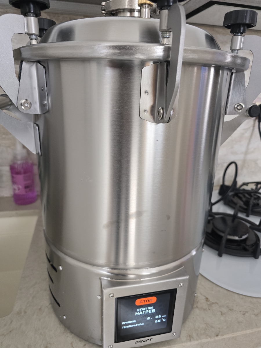 Год назад купил заготовщик на 28л и теперь пришел к решению, что нужен мне смарт, чтоб не следить за автоклавов в течении всего процесса. Заказал смарт, так как понравилась на заготовщике конструкция крышки. К недостаткам типо острые кромки и небольшие следы окислений был морально готов. Готовил уже три раза, желудки в азиатском соусе из книги рецептов,и которая шла с автоклавов, тушёнку с загрузкой 17 банок и первый раз сделал загрузку из 16 реторт пакетов, все целое. Я очень доволен, поставил его в мастерской, включил и забыл до конца процесса. А с заготовщиком приходилось делать дома и постоянно следить за температурой, временем и чтоб дети рядом не ходили в целях безопасности. При готовке в реторт пакетах установил вместо заглушки манометр, чтоб проконтролировать давление, при 115 градусов давление было 1,8 бар.