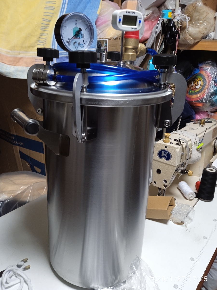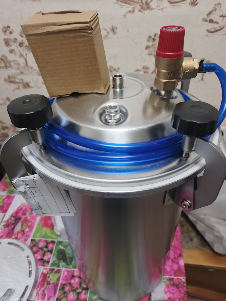 Проверку прошёл на отлично. Около 100 градусов дышащий клапан закрылся, давление на манометре стразу плавно пошло вверх. От 1.5 атмосферы основной клапан сработал и стал стравливать лишнее давление. Температуру автоклав набрал 120-123 гр. На фото показал.
